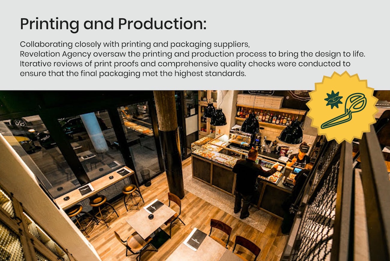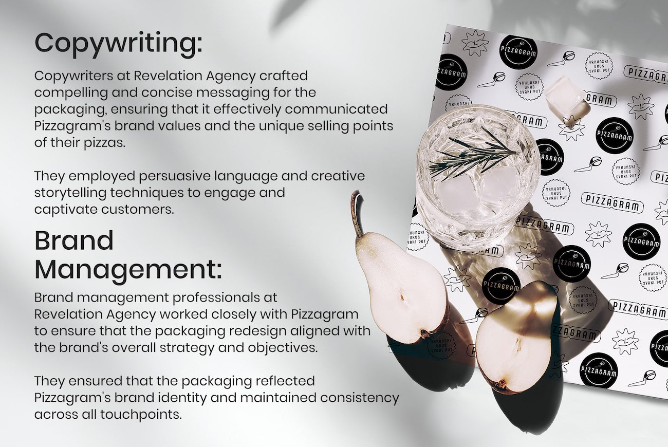 Copywriting: Copywriters at Revelation Agency crafter compelling and concise messaging for the packaging, ensuring that it effectively communicated Pizzagram’s brand values and the unique selling points of their pizzas. They employed persuasive language and creative storytelling techniques to engage and captivate customers.