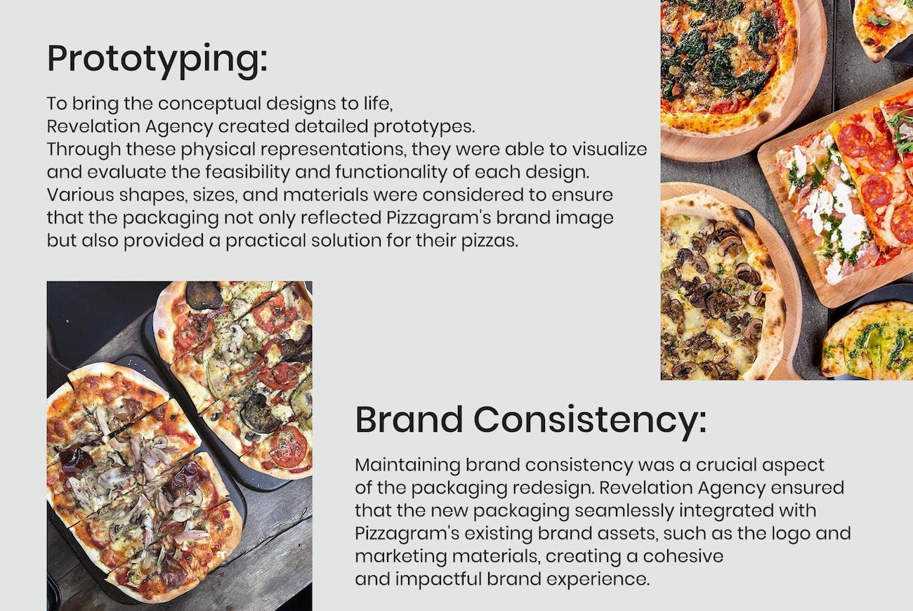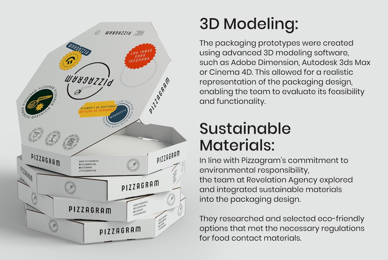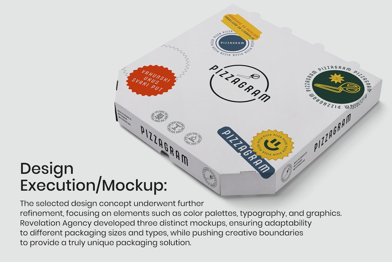 Graphic Design: The team of graphic designers at Revelation Agency utilized industry-standard software such as Adobe Illustrator and Photoshop to create visually captivating designs for Pizzagram’s packaging. They incorporated Pizzagram’s existing brand assets, such as the logo, into the packaging design to maintain brand consistency.