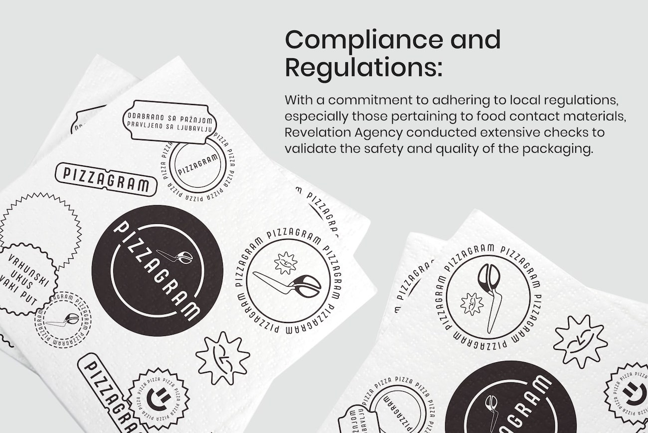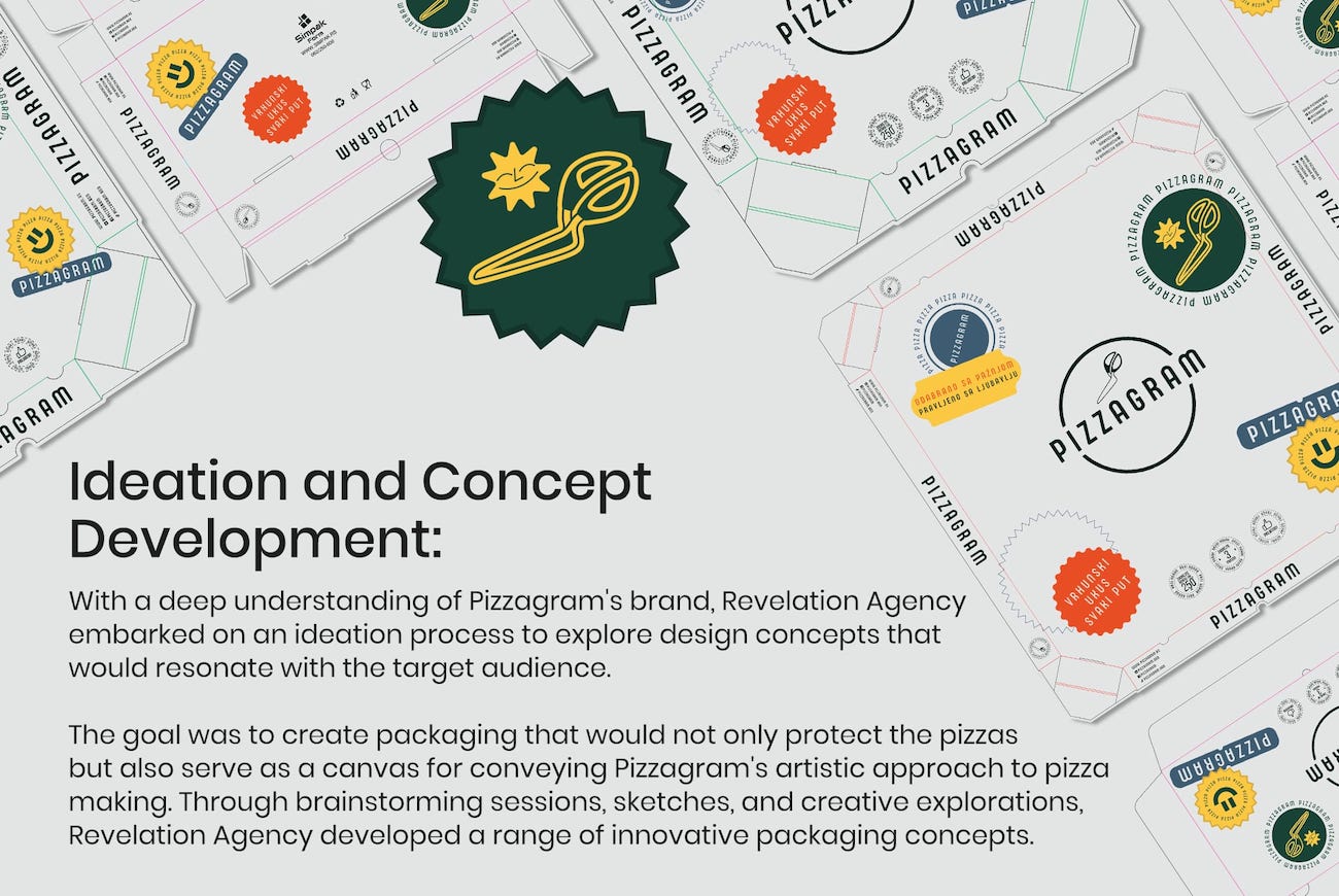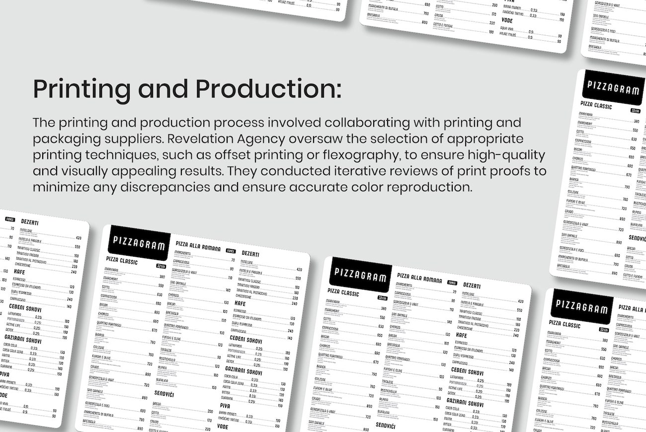 Graphic Design: The team of graphic designers at Revelation Agency utilized industry-standard software such as Adobe Illustrator and Photoshop to create visually captivating designs for Pizzagram’s packaging. They incorporated Pizzagram’s existing brand assets, such as the logo, into the packaging design to maintain brand consistency.